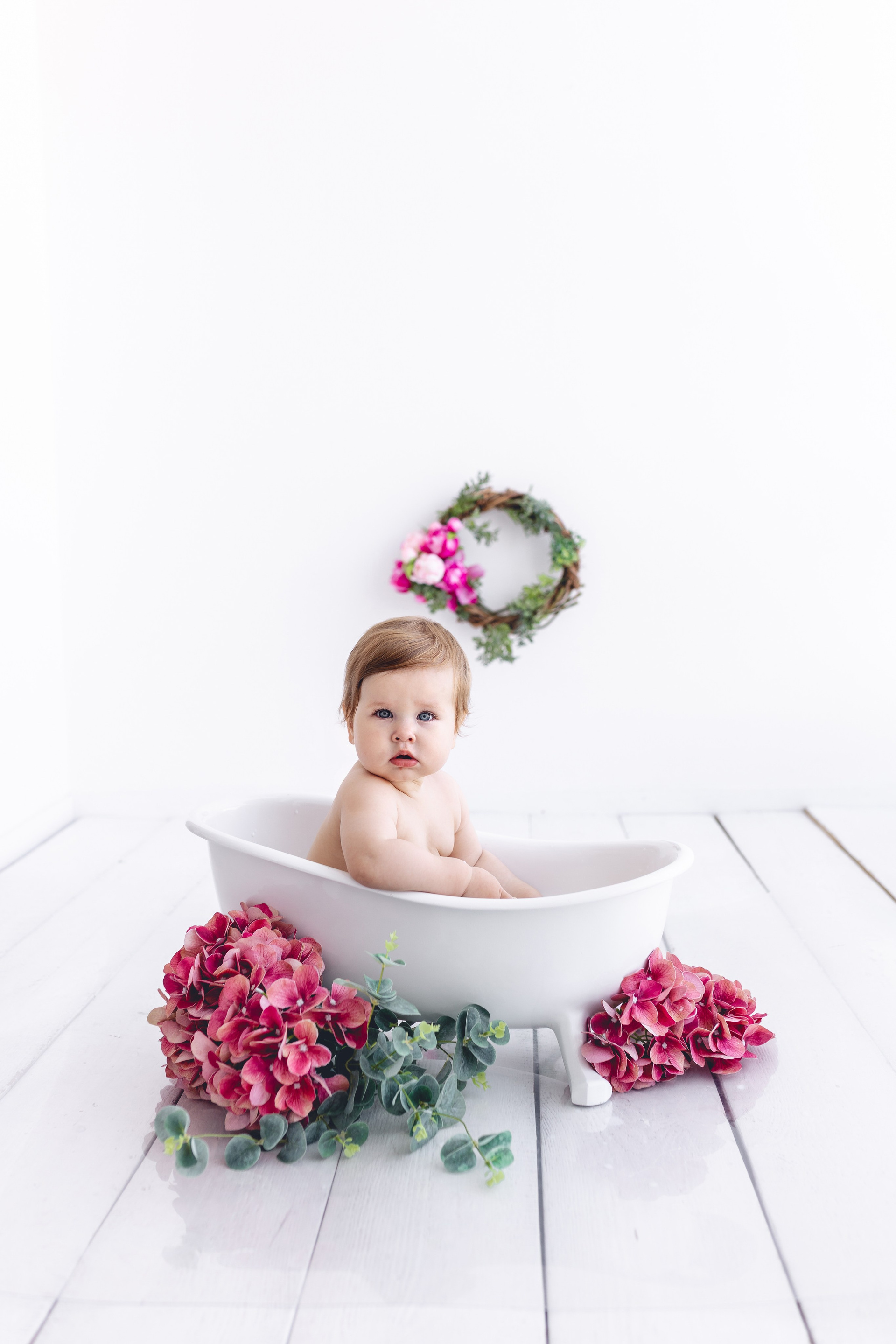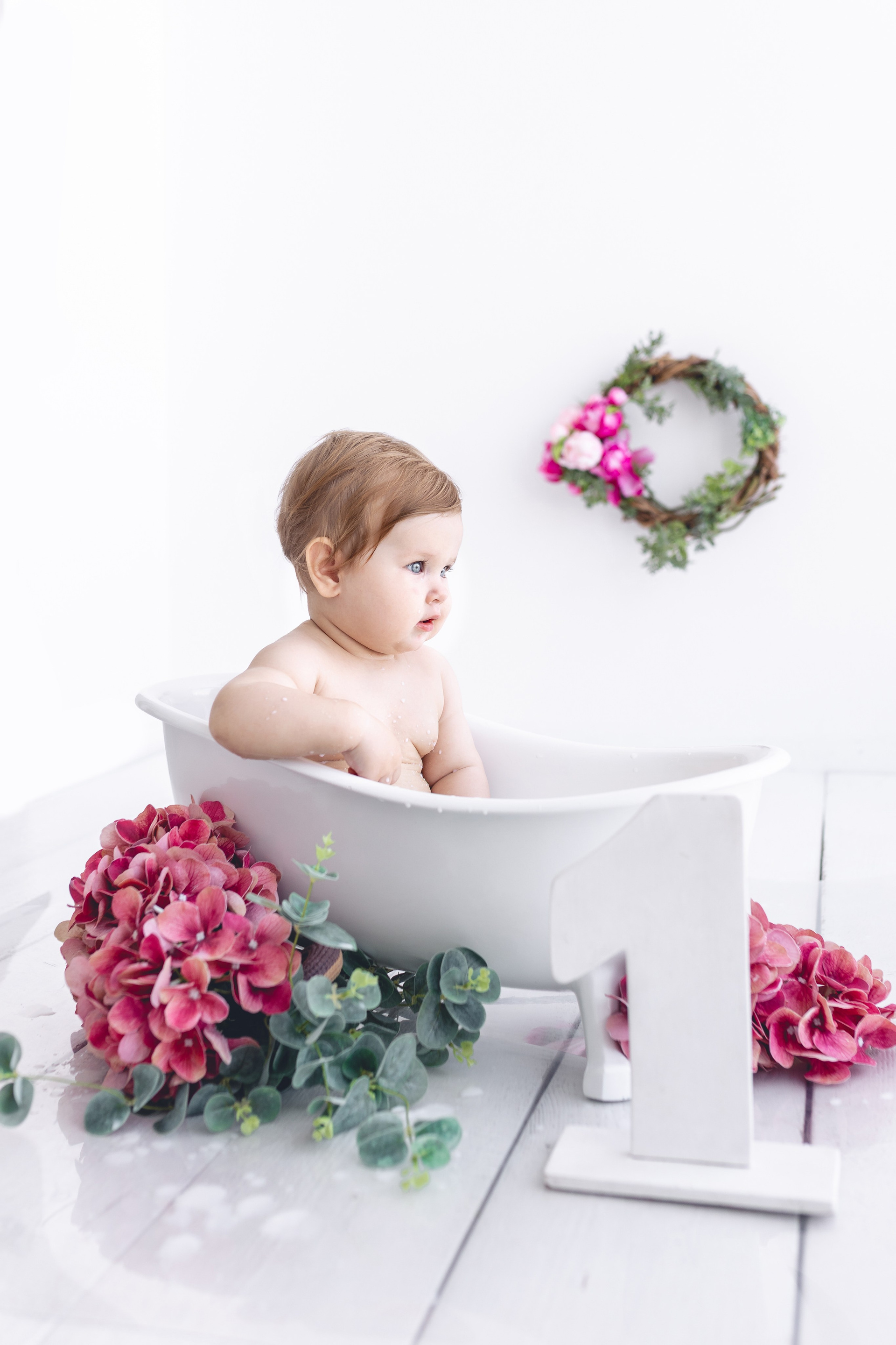 Можно также организовать купание в молочной ванне. В небольшую ванночку наливается разбавленное тёплой водой молоко. Туда садим малыша, он плещется — а я фотографирую эти эмоции)) Доплата за ванночку 500 руб в студию. Необходимо взять с собой 1 л молока и полотенце.